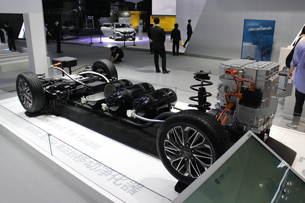 新能源汽车底盘展示模型。人民网 鄂智超 摄