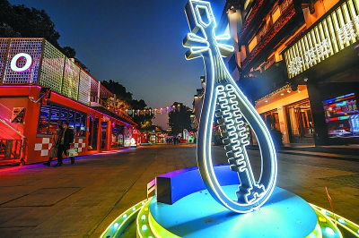 南京都市圈讯 裸眼3D投影、互动的钢琴键、闪烁的琵琶等造型小品……继贡院街、大石坝街后,夫子庙地区又新增一条网红步行街——琵琶街,处处凸显的音乐元素吸引了大批游客驻足打卡。