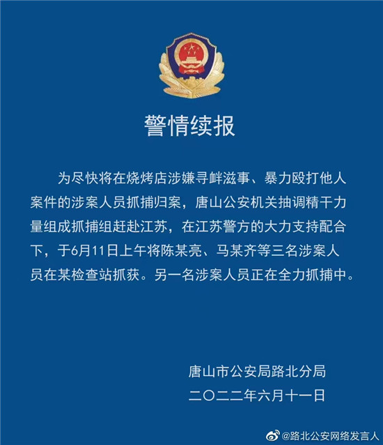 警方通报:唐山烧烤店打人事件又抓获3人,另一人正全力抓捕中