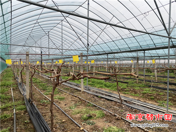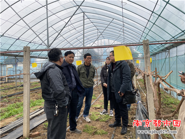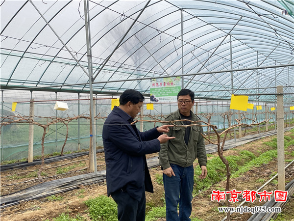 南京都市圈讯 2月27日上午,镇江农科院生态农业研究室主任、果树绿色防控专家吉沐祥研究员,在溧阳市园艺站和植保植检站技术推广负责人的陪同下,专程赶到位于溧阳市天目湖镇毛尖村南东山上村的溧阳市天目乐园种植家庭农场葡萄大棚里,现场察看葡萄长势,针对当前葡萄生产上存在的问题,进行“绿色防控”等方面现场技术指导以及答疑解惑。