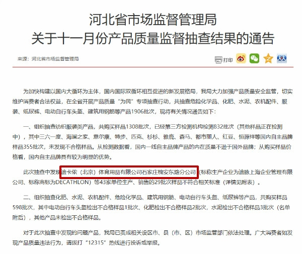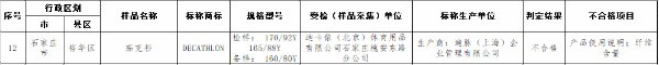 其中,迪卡侬(北京)体育用品有限公司石家庄槐安东路分公司销售、迪脉(上海)企业管理有限公司生产的1批次DECATHLON茄克衫不合格,不合格项目为产品使用说明及纤维含量。