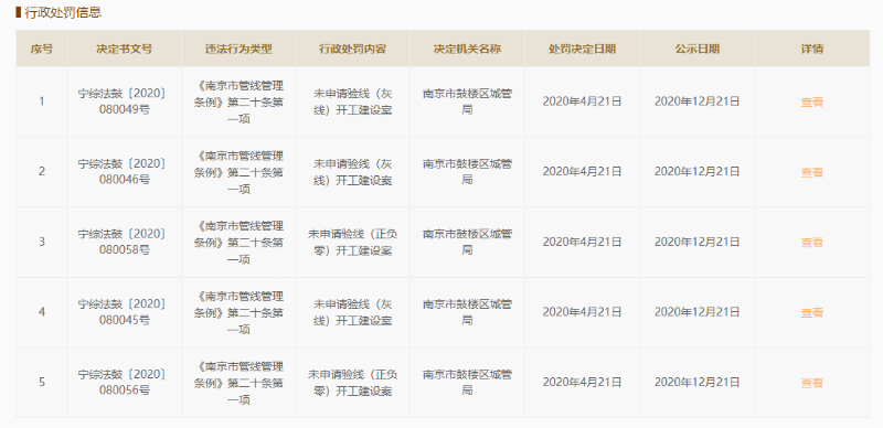 据国家企业信用信息公示系统网站公示信息,近日,南京临江老城改造建设投资有限公司(以下简称“南京临江老城改造公司”)因未申请验线(灰线)开工建设及未申请验线(正负零)开工建设,违反《南京市管线管理条例》第二十条第一项,被南京市鼓楼区城管局行政处罚14次。