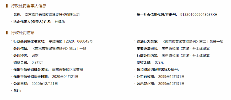 值得注意的是,在此次连收14张罚单不久前,2020年1月10日,南京临江老城改造公司就曾因未申请验线(正负零)开工建设收到过南京市鼓楼区城管局的行政处罚,罚款金额同为0.5万元。