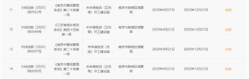 中国网财经还发现,这14次行政处罚的日期均为2020年4月21日,且行政处罚决定书文号为连号(宁综法鼓〔2020〕080045-080058号),罚款金额均为0.5万元,14张“罚单”共计7万元。其中,8起行政处罚的主要违法事实为未申请验线(灰线)开工建设,6起行政处罚的主要违法事实为未申请验线(正负零)开工建设。