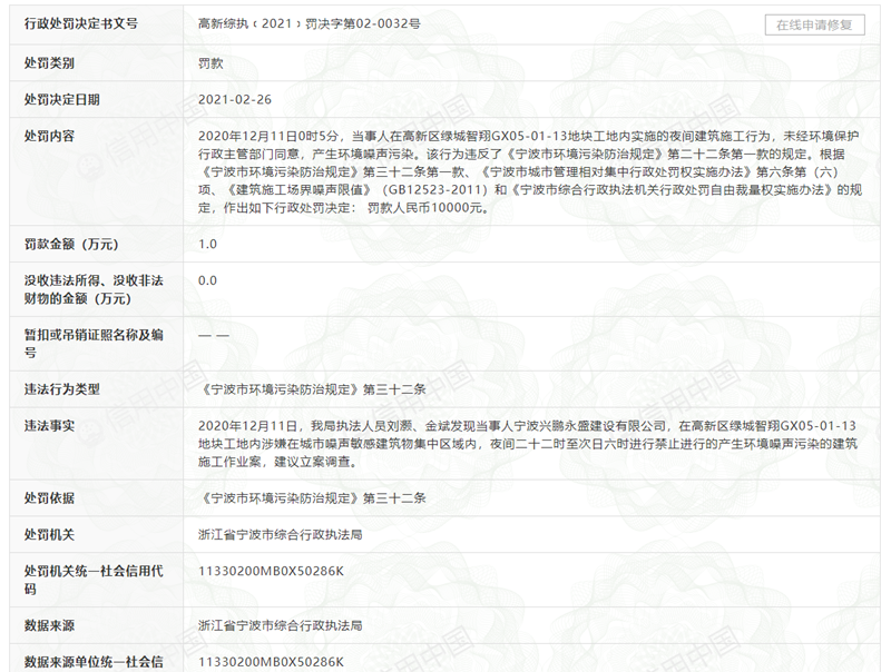 据信用中国网站消息,近日,浙江省宁波市综合行政执法局对宁波兴鹏永盛建设有限公司(下称:“兴鹏永盛建设”)罚款1万元。