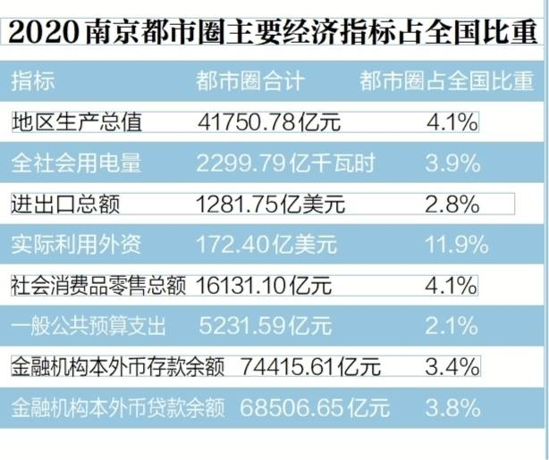 2020年,南京都市圈实现生产总值41750.78亿元,占全国比重为4.1%,较2019年全年提升0.1个百分点;10个地区的GDP增速都快于全国平均水平;