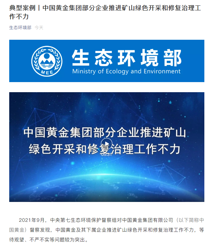 通报显示,2021年9月,中央第七生态环境保护督察组对中国黄金集团有限公司(以下简称中国黄金)督察发现,中国黄金及其下属企业推进矿山绿色开采和修复治理工作不力,等待观望、不严不实等问题较为突出。