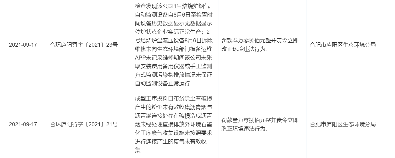 合肥市庐阳区生态环境分局17日作出的处罚决定显示,合肥炭素有限责任公司对成型工序投料口布袋除尘有破损产生的粉尘未有效收集,沥青烟与沥青罐连接处存在破损,造成沥青烟未经处理直接排放外环境;石墨化工序废气收集设施未按照要求进行连接,产生的废气未有效收集。