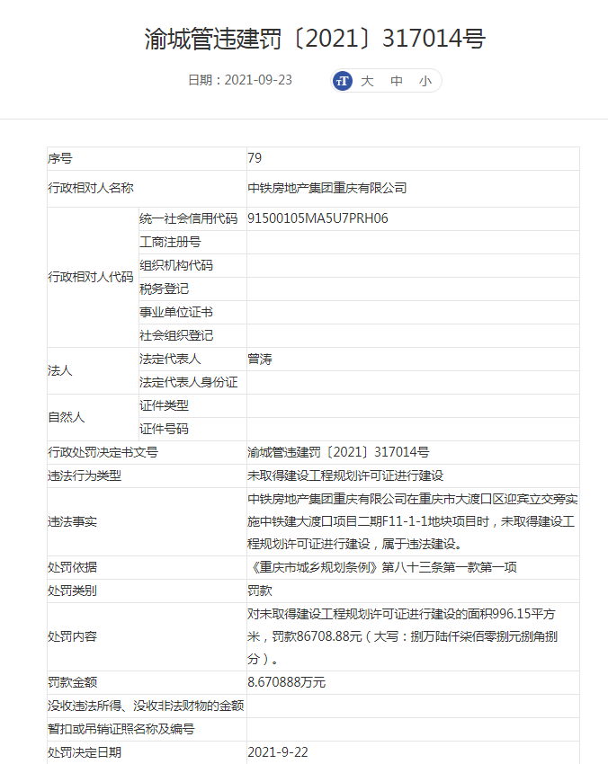 行政处罚决定书显示,中铁房地产集团重庆有限公司在重庆市大渡口区迎宾立交旁实施中铁建大渡口项目二期F11-1-1地块项目时,未取得建设工程规划许可证进行建设,属于违法建设。