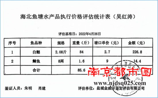 (图片说明:法院委托专门评估公司对吴红涛鱼塘水产品价值评估,其价值仅241.2元卖鱼款。但要收取200多万元“占用费”)
