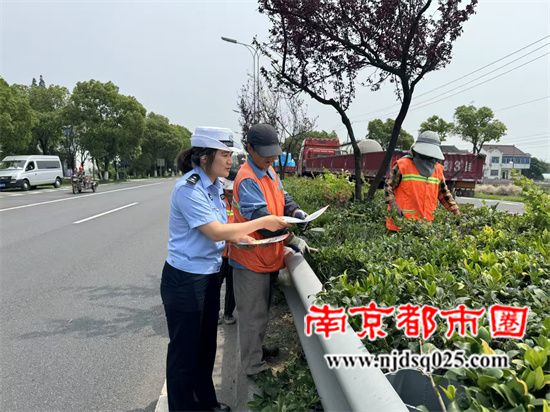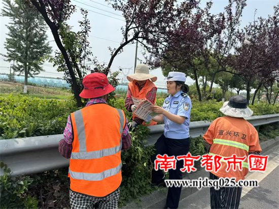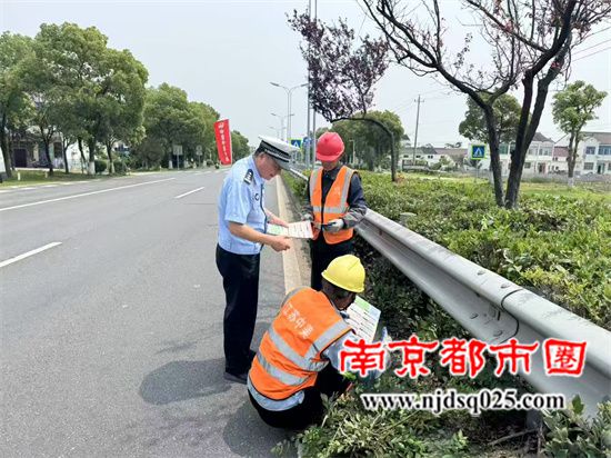 在绿化施工现场,民警与江苏中美环境工程有限公司施工人员对面对面宣传交通安全知识,讲解遵守交通规则的重要性,确保遵守交通规则前题下的安全施工。