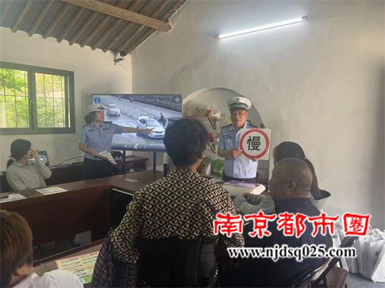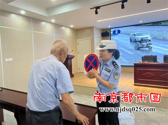“这是什么交通标识”?”这是慢行标识。”交警用日常简单的交通标识让老人们辩识。